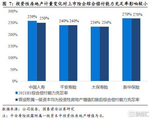 根據償付能力報告披露,上市險企投資性房地產計入附屬一級資本的規模非常小,因此投資性房地產計量標準變化對上市險企幾乎無影響。極端假設下,假設當前所有附屬一級資本均爲投資性房地產增值部分,扣除後上市險企綜合償付能力充足率幾乎沒有下降。
