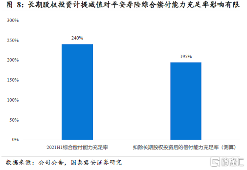 大型險企得益於較大的投資體量,個別長期股權投資計提減值對綜合償付能力充足率影響不大。極端假設下,假設平安壽險所有長期股權投資全部計提減值,即長期股權投資的認可價值爲0,那麼對綜合償付能力充足率的負面影響爲45pt。