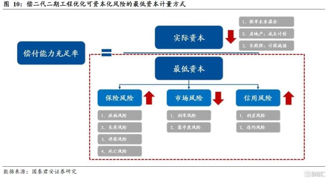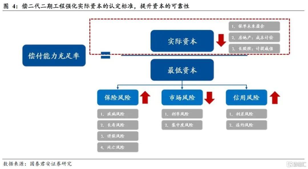 償二代二期提升實際資本認定標準,優化最低資本結構:1)實際資本認定更爲嚴格,計入核心資本的保單未來盈餘上限爲35%:對剩餘邊際資本分級,分別根據保單剩餘期限納入核心一級、核心二級、附屬一級和附屬二級資本;對投資性房地產進行成本計價;對長期股權投資要求計提減值等,目的是避免過多未實現的未來預期利潤進入償付能力資本,夯實實際資本質量;2)優化可資本化風險的最低資本結構,提升保險風險和信用風險佔比、降低市場風險佔比:一是提升保險風險,包括新增疾病趨勢風險、延長長壽風險、由按保單件數改爲按產品類別衡量退保風險、以及取消死亡發生率風險的規模效應;二是降低市場風險,加大利率風險的資產評估範圍,由以公允價值計量的資產改爲所有對利率敏感的資產,通過資產負債匹配管理降低利率風險;三是調整信用風險,實施底層資產穿透,準確反映風險實質,預計行業信用風險佔比大概率提升。