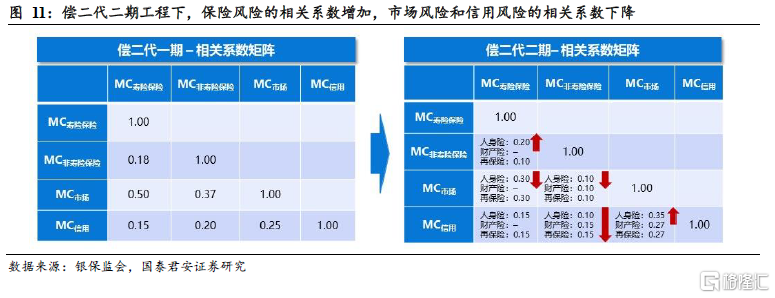 相關係數方面,償二代二期工程根據保險公司歸屬行業細化各類可資本化風險的相關係數,總體上保險風險的相關係數增加,市場風險和信用風險的相關係數下降。