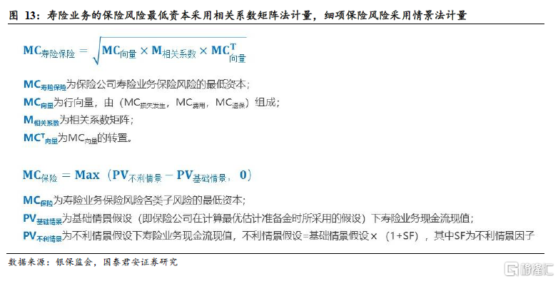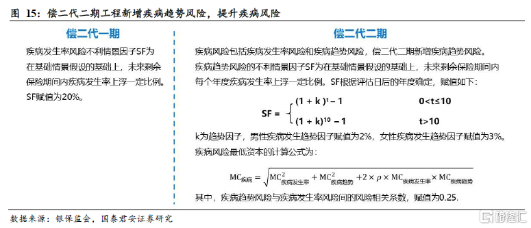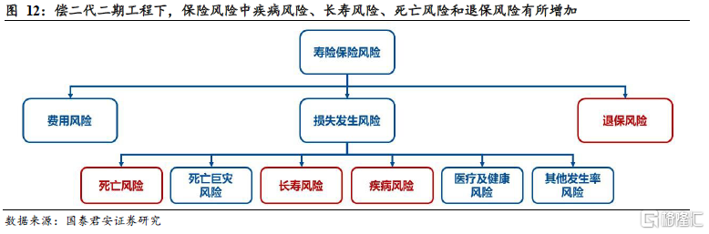 保險公司壽險業務的保險風險最低資本採用相關係數矩陣法計量,各細項保險風險的最低資本採用情景法計量,即分別在基礎情景假設和不利情景假設下計算評估日的現金流現值,最低資本等於兩種情景下的現金流現值之差。償二代二期工程重點優化四類壽險保險風險的計量方式,核心通過調整不利情景因子(SF)來提升保險風險佔比,分別爲在疾病風險中新增疾病趨勢風險、延長長壽風險、由按保單件數改爲按產品類別衡量退保風險,以及取消死亡發生率風險的規模效應。