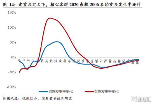 考慮到近年來重疾發生率呈現明顯惡化趨勢,在償二代二期工程中,在原有疾病發生率風險的基礎上,新增疾病趨勢風險,指由於疾病惡化趨勢實際經驗高於預期而使保險公司遭受非預期損失的風險。根據2020年銀保監會披露的重疾定義表,在可比的老定義重疾下,核心客羣的2020表較2006表的重疾發生率明顯提升,其中女性發生率的重疾發生率高於男性。數據顯示,18-56歲的女性重疾發生率提升,20-44歲的男性重疾發生率提升。相應的,在疾病趨勢風險中,男性疾病發生趨勢因子賦值爲2%,女性疾病發生趨勢因子賦值爲3%。