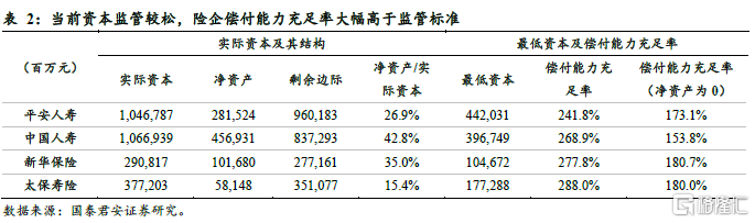 在償二代一期工程的體系下,監管對於資本的額要求相對寬鬆,大部分保險公司的償付能力充足率大幅高於監管標準,也就是說,保險公司的業務發展並沒有受到資本的約束。根據我們測算,在淨資產爲0的極端假設下保險公司仍然能夠維持極高的償付能力充足率。