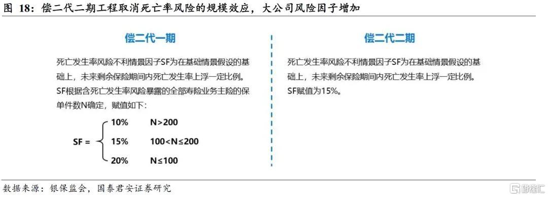 死亡發生率風險屬於水平風險,而保單件數的規模效應在水平風險上並不會明顯體現,因此償二代二期工程在計量死亡發生率風險時取消根據保單件數的規模對風險因子的區分,大小公司均採用統一的風險因子計量。這一變化下,預計原先具有規模效應優勢的大型公司的死亡發生率風險有所提升。
