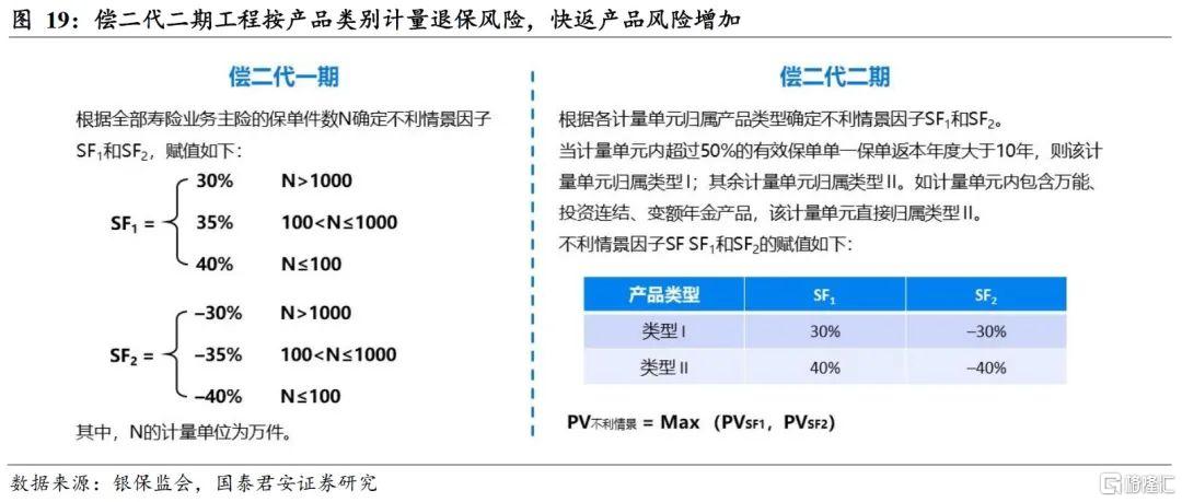 考慮到不同類別的產品退保風險表現不同,償二代二期工程在計量退保風險時,由原先的按照全部壽險業務的保單件數計量,轉變爲根據產品類別計量。根據各家公司提供的典型產品信息,“返本年度10年”是一個較爲有區分度的標準,因此償二代二期工程下按照返本年度是否大於10年來劃分不同的退保風險,即當計量單元內超過50%的有效保單單一保單返本年度大於10年,則該計量單元歸屬類型I,對應不利情景 因子爲+/-30%;其餘計量單元歸屬類型II,對應不利情景 因子爲+/-40%。