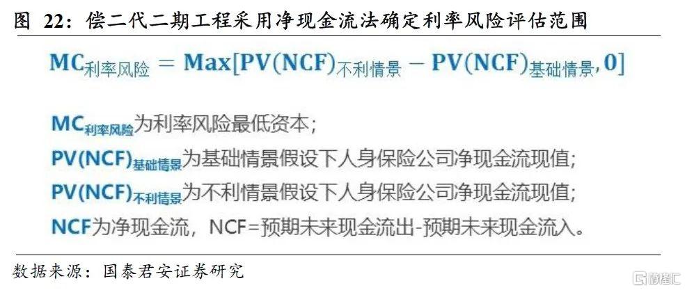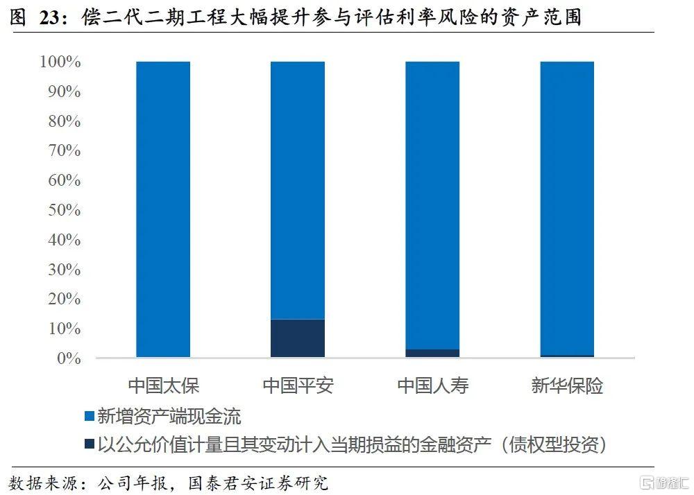 一方面,償二代二期工程在負債端壽險業務現金流評估範圍不變的基礎上,加大參與評估利率風險的資產範圍,即資產端由原先的僅評估以公允價值計量的資產改爲評估所有對利率敏感的資產,從而降低用於評估利率風險的淨現金流規模。預計用於評估利率風險的資產規模顯著下降,因而將有效降低利率風險的最低資本要求。