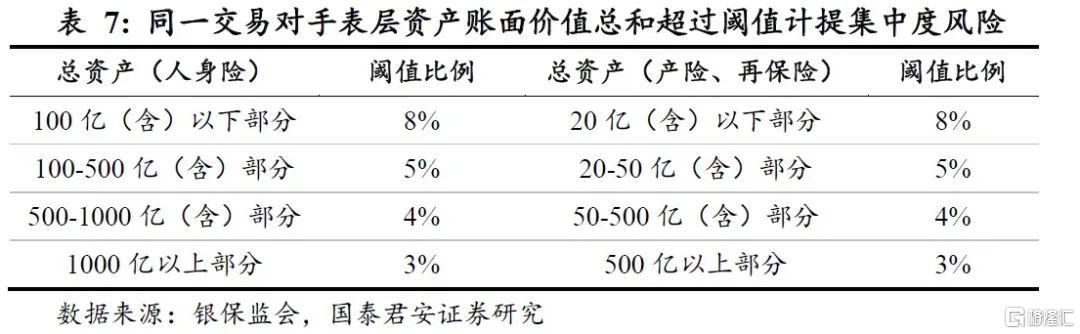 1)交易對手集中度風險方面,當同一交易對手錶層資產賬面價值總和超過以保險公司總資產計量的風險敞口閾值時,將計提交易對手集中度風險,特徵係數k集中度1=0.4;