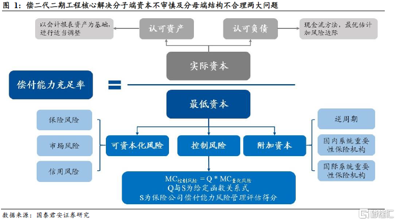償付能力充足率是保險公司實際資本與最低資本的比值。在償二代一期工程的體系下,償付能力充足率計量方式並不合理。在分子端,剩餘邊際全部納入核心資本,且投資性房地產、長期股權投資等的認可資產確認方式寬鬆,資本認定並不審慎;在分母端,最低資本由保險風險、市場風險和信用風險組成,其中市場風險佔比大幅高於保險風險,導致保險公司較大程度利用資產配置便利調節償付能力水平,資產端操作空間較大。償二代二期工程核心解決分子端實際資本不夠審慎及分母端最低資本結構不合理兩大問題。