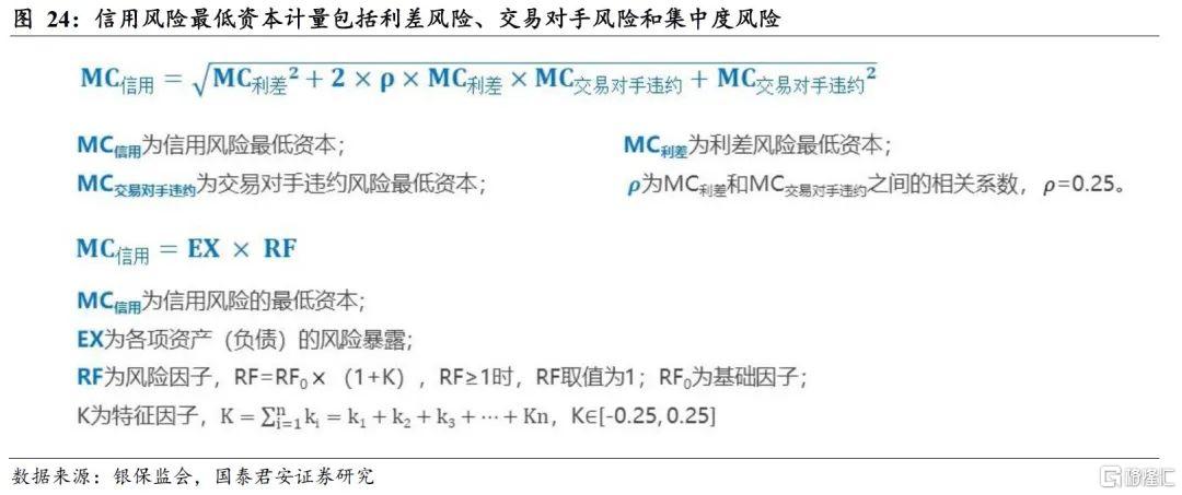 信用風險指由於利差的不利變動,或者由於交易對手不能履行或不能按時履行其合同義務,或者交易對手信用狀況的不利變動,導致保險公司遭受非預期損失的風險,包括利差風險、交易對手違約風險和集中度風險。信用風險最低資本計量方面,利差風險與交易對手違約風險採用相關係數法計量,集中度風險通過特徵因子K體現在相關具有高集中度風險資產中。