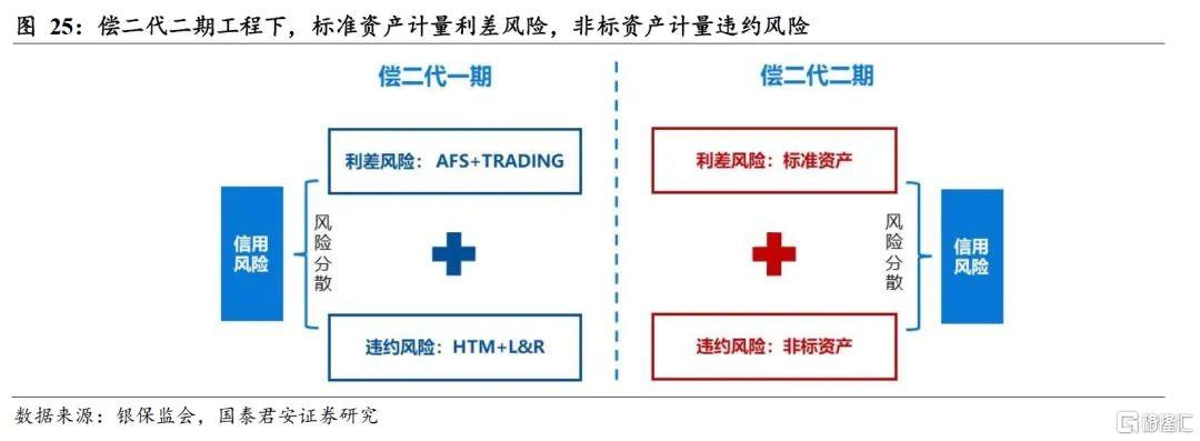 償二代一期工程的邏輯主要是財務導向,根據資產的會計計量方式劃分對應的信用風險。但考慮到會計計量的劃分方式本不影響資產的質量,在償二代二期工程下重點考慮資產本身風險,而不考慮具體的會計分類,風險計量體現資產實際的風險暴露情況,因而在償二代二期工程下,對資產的風險劃分爲標準資產計量利差風險、非標資產計量違約風險。