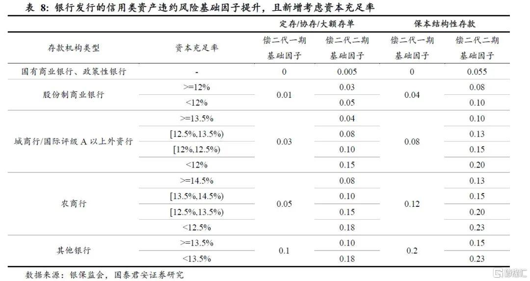 違約風險指由於交易對手不能履行或不能按時履行其合同義務,或者交易對手信用狀況的不利變動,導致保險公司遭受非預期損失的風險。在償二代二期工程下,用於計量交易對手違約風險的資產包括銀行發行的信用類資產、債權類非基礎資產等非標債權類資產。一方面,隨着近年來部分中小銀行的破產事件發生,償二代二期工程對銀行發行的信用類資產的違約風險基礎因子有所提升,且根據銀行資本充足率的情況差異化賦值。