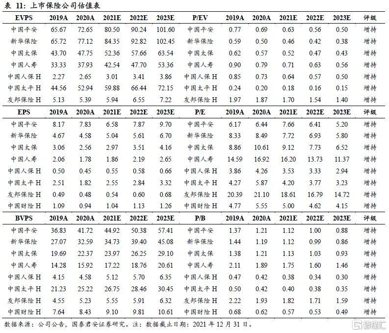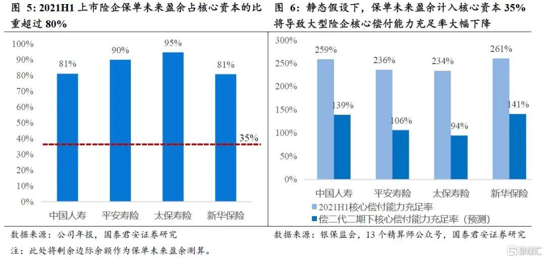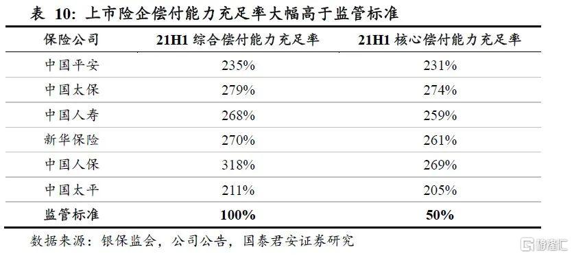 短期來看,在償二代二期工程下,分子端保險公司的未來盈餘不能全部計入實際資本,且未來盈餘計入和核心資本的比例上限爲35%;分母端保險風險的佔比有所提升,預計最低資本的要求隨之增加,相對應的保險公司的綜合償付能力充足率和核心償付能力充足率均將面臨下降,且核心償付能力充足率的下降幅度預計更大。其中,部分中小保險主體預計受制於資本監管更爲嚴格,在償二二期體系下面臨補充資本壓力;而主要上市險企得益於當前償付能力充足率大幅高於監管標準且業務結構更爲合理,預計能夠實現新老準則的平穩過渡,且不會影響現有的分紅邏輯。截至2021年上半年末,上市險企的綜合償付能力充足率分別爲:中國人保(318%)>中國太保(279%)>新華保險(270%)>中國人壽(268%)>中國平安(235%)>中國太平(211%);核心償付能力充足率分別爲:中國太保(274%)>中國人保(269%)>新華保險(261%)>中國人壽(259%)>中國平安(231%)>中國太平(205%)。