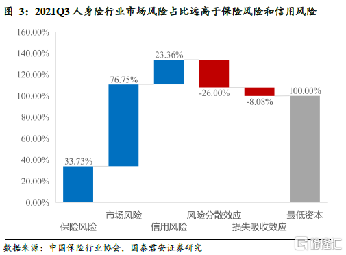 償二代二期工程核心解決的問題之二在於優化最低資本結構,降低資產端操縱風險。最低資本由保險風險、市場風險和信用風險組成,當前最低資本要求結構相對不合理,其中保險風險和信用風險佔比較低、市場風險佔比較高,因而保險公司主要通過調整資產結構而非負債結構來提升償付能力。數據顯示,2021年三季度,人身險行業市場風險佔比高達76.75%,而保險風險和信用風險的佔比分別僅爲33.73%和23.36%。