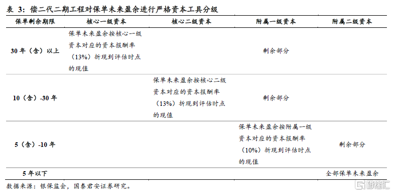 從實際資本的角度來看,償二代二期工程通過保單未來盈餘的方式對實際資本進行資本分級,將剩餘期限較短的資產納入附屬資本,預計將推動行業加大長期業務的拓展力度,從而維持核心資本的長期充足。