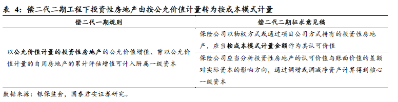 償二代二期工程對資產計入資本的方式做出更爲審慎的監管要求,一方面,投資性房地產的計量由原先的公允價值計量增值部分可計入附屬一級資本轉變爲按成本計量,大幅減小了地產市場上漲對公司實際資本帶來的虛增。