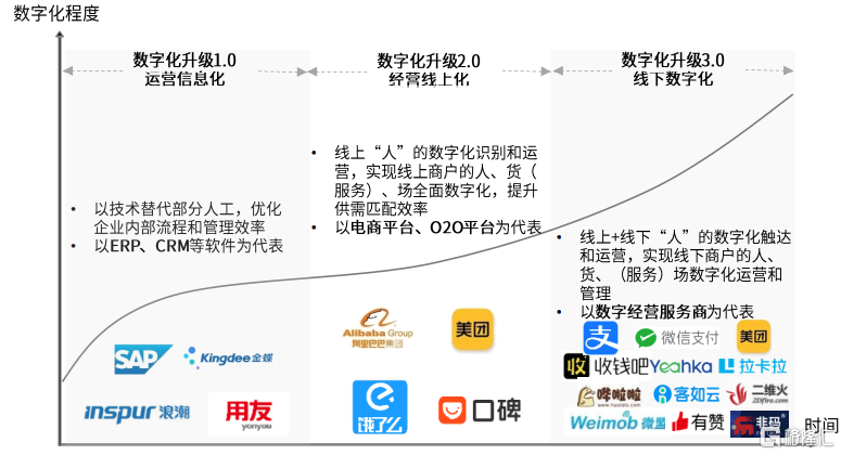 我們認為,商家的數字化升級經歷了三個階段,分別是運營信息化(以ERP、CRM等軟件為代表)、經營線上化(以電商平台為代表)以及線下數字化(以數字化經營服務商為代表)。商家數字化轉型3.0階段始於移動支付的出現,線下客流得以數字化、幫助線下商家實現對消費者的數字化觸達,以及對“人、貨/服務、場”進行更好的數字化運營和管理。
