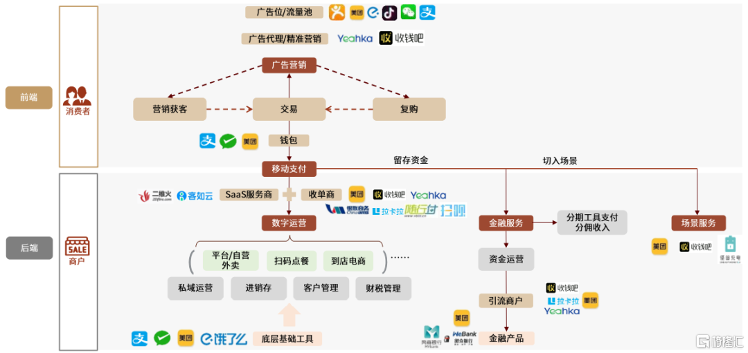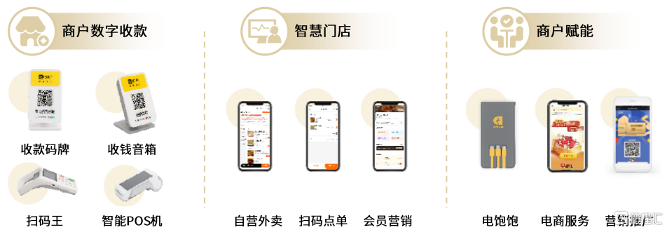 ► 基於支付入口拓展數字化升級服務——基於支付入口和複用線下地推能力,聚合支付服務商能夠減少獲客成本、精準洞察商户需求、快速推廣商家服務,進而不斷豐富數字化升級服務生態,提供多行業、多業務環節的商家服務解決方案;