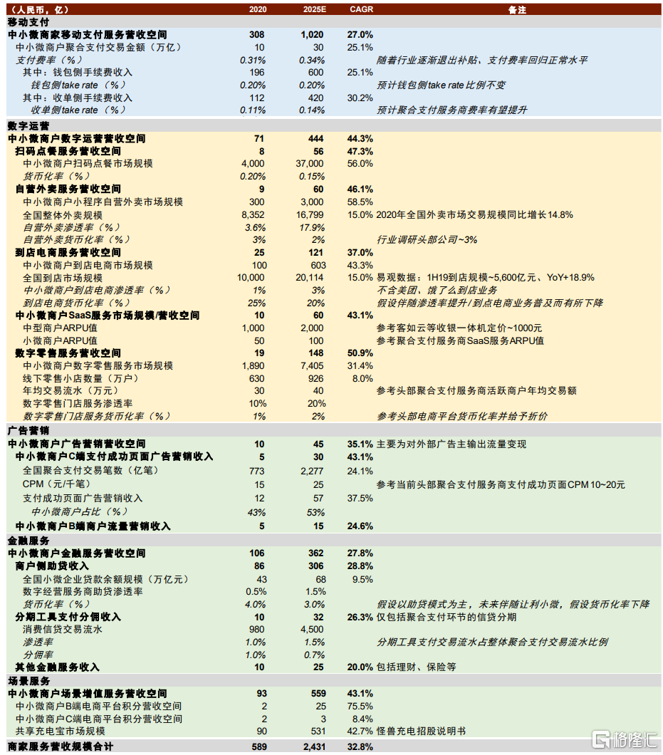 數字化升級進入3.0階段,線下中小微商家服務市場的增長拐點已至、帶來千億元營收蛋糕。1)供需驅動及疫情催化下,我國線下商户的數字化升級市場迎來加速發展。2)相較於競爭激烈的大型商家服務市場,線下中小微商户市場仍是藍海:服務大型商户能夠快速增收、樹立標杆效應,從而吸引了大量參與者;歷史上線下中小微商户“CAC>>LTV”的特性導致對其服務的空白,但伴隨着移動支付/小程序等數字基礎設施完善對服務門檻的降低,領先的數字經營服務商得以進入該細分市場。3)我們認為線下中小微商家服務產業鏈=移動支付+數字運營+廣吿營銷+金融服務+場景增值服務五大環節,測算2025年其營收規模有望達到2,431億、對應未來五年CAGR 33%,同時2025年非支付業務的毛利潤貢獻有望達近70%。