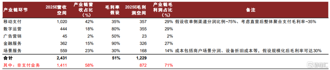 當前線下中小微商户市場中,據我們測算,2025年產業鏈規模可達2,431億元,其中各產業鏈細分環節營收空間分別為移動支付1,020億元(收單側420億元)、場景服務559億元、數字運營444億元、金融服務362億元、廣吿營銷45億元;而從毛利貢獻角度,我們測算2025E產業鏈各細分環節毛利潤空間分別為移動支付357億元、數字運營355億元、金融服務326億元、場景服務168億元、廣吿營銷23億元,其中非支付業務2025年毛利潤佔比有望達71%。
