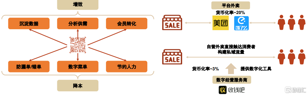 ► 需求側——伴隨用户消費習慣的遷移、商户數字化升級意願提升:1)線上“開源”——隨着互聯網平台提供更多的內容、商品和服務,消費者在線上找尋產品與服務並完成交易的習慣逐步養成,線下商家進行線上獲客及提升ARPU的重要性也將不斷增加。2)經營“節流”——商家在運營過程中通過一系列數字化工具(如掃碼點單、會員管理、自營外賣和進銷存管理等),可以減少商户人力及租金成本、提升經營效率。