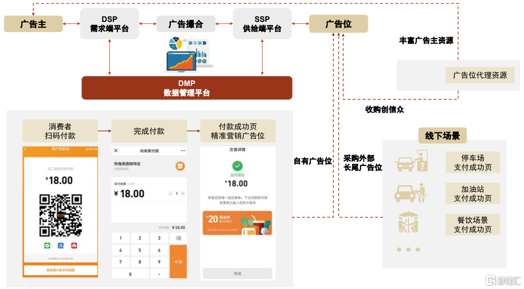 ► 廣吿營銷:1)基於C2B支付獲取C端流量——數字經營服務商在線下C2B支付交易中能夠直接觸達消費者、獲取C端流量,並基於交易數據為消費者構建用户畫像、對線下商户和外部廣吿主輸出精準營銷能力,如在支付成功頁面為商户和廣吿主提供營銷/發券的廣吿位,但支付成功頁面大多位於支付寶/微信支付中、相關廣吿位變現潛力受制於錢包側巨頭;2)基於C2B支付獲取B端流量——數字經營服務商的自有APP成為線下商户洞察交易流水、獲取各類商家服務的入口,為服務商提供了B端流量和可用於流量變現的廣吿位,如收錢吧APP擁有上百萬月度活躍商户。
