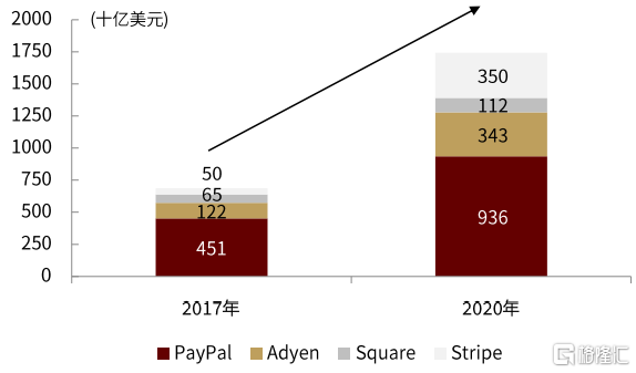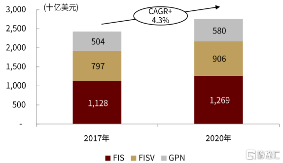 圖表34:2017-2020年三大傳統收單商美國地區交易量CAGR~4.3%