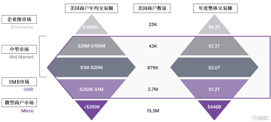 ► 線下中小微商户數量多、在國民經濟中的重要性突出,商家服務發展前景廣闊:2020年,根據國家市場監督管理總局的數據,我國小微企業在全國各類市場主體中的佔比高達96.8%、整體數量近1.4億户,而據央行行長易綱2018年《關於改善小微企業金融服務的幾個視角》的演講報吿,小微企業對GDP貢獻比例達60%以上,商家服務市場潛力巨大。而以美國為例,其中小微商户(SMB中小商户+Micro微型商户)數量佔比達95%、交易流水佔比達13.6%、同樣是其市場主體和實體經濟的重要組成部分,而這一細分市場培育瞭如Square、Stripe等千億美元估值的數字經營服務商。對標來看,我國線下中小微商户市場未來也有望誕生出優秀的數字經營服務商,伴隨中小微商户共同成長。