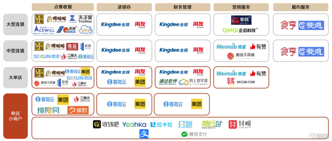 當前,大型商户市場參與者較多、市場競爭相對激烈,主因服務大型商户能夠快速增收、並幫助服務商樹立標杆效應。與之相比,線下中小微商户數量多、市場發展前景廣闊,但線下中小微商家服務仍在發展初期、服務商主要集中於餐飲/零售/生活服務等行業。未來,伴隨數字化基礎設施的逐漸成熟,我們認為線下中小微商户市場有望湧現出一批綜合能力突出、持續陪伴商户成長的數字經營服務商。
