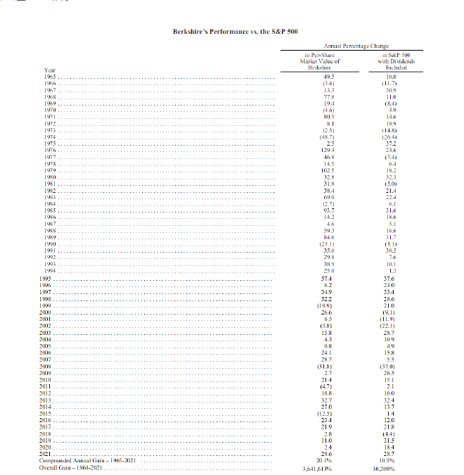 依照慣例,股東信開始還是伯克希爾的業績與美股風向標:標普500指數表現的對比,2021年伯克希爾每股市值的增幅是29.6%,標普500指數的增幅是28.7%,伯克希爾跑贏了0.9個百分點。長期來看,1965-2021年,伯克希爾每股市值的複合年增長率爲20.1%,明顯超過標普500指數的10.5%,而1964-2021年伯克希爾的市值增長率是令人吃驚的3641613%,也就是36416倍多,而標普500指數爲30209%,即超過302倍。