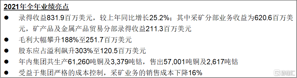 年內,受益於基準銅價及鈷價上漲,集團實現收益831.9百萬美元,同比增長25.2%。其中採礦業務總收益爲620.6百萬美元,同比增長24.7%,礦產品及金屬產品貿易分部錄得收益211.3百萬美元,同比增長26.6%。此外,由於成本控制得宜,集團毛利大幅攀升188%至251.7百萬美元,加上2021年銅價及鈷價攀升,集團毛利率從2020年的13%大幅提高至2021年的30%。