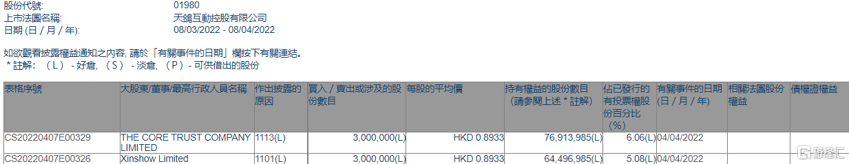 格隆匯APP獲悉,根據聯交所最新權益披露資料顯示,2022年4月4日,天鴿互動(01980.HK)獲THE CORE TRUST COMPANY LIMITED在場內以每股均價0.8933港元增持300萬股,涉資約267.99萬港元。