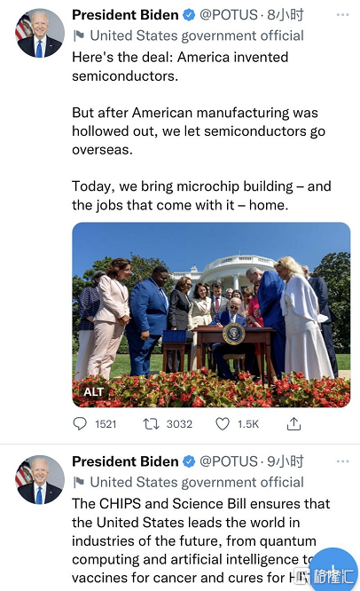 拜登還在社交平臺表示:美國發明瞭半導體,但美國製造業被掏空後,讓半導體走向海外。今天,我們將微芯片製造以及隨之而來的工作帶回來。