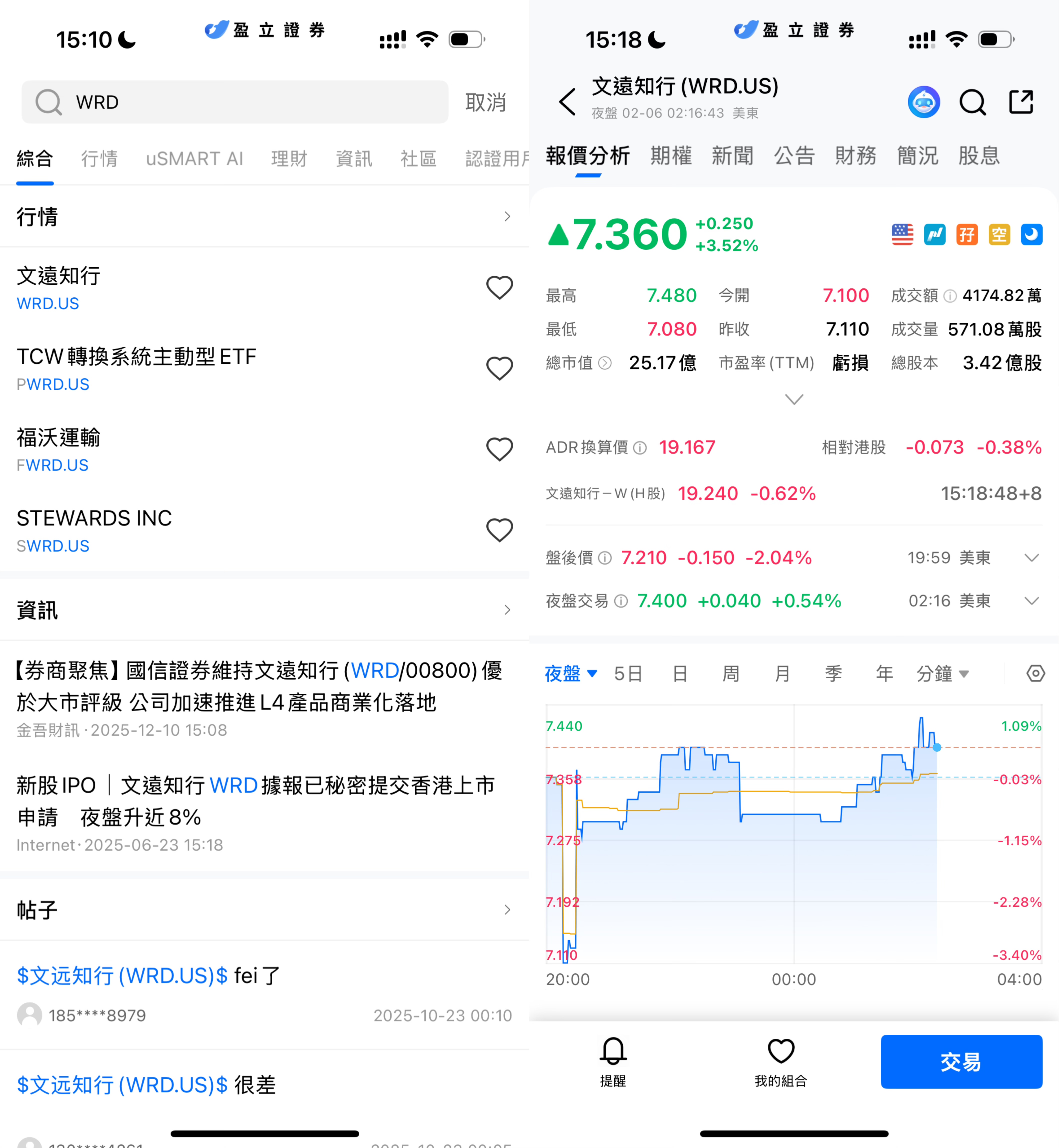 登入 uSMART HK APP 後,於頁面最右上方點擊「搜索」,輸入標的代碼(WRD.US)並進入詳情頁,瞭解交易詳情與歷史走勢。點擊右下角「交易」,選擇交易類型,最後填寫交易條件後送出訂單即可。