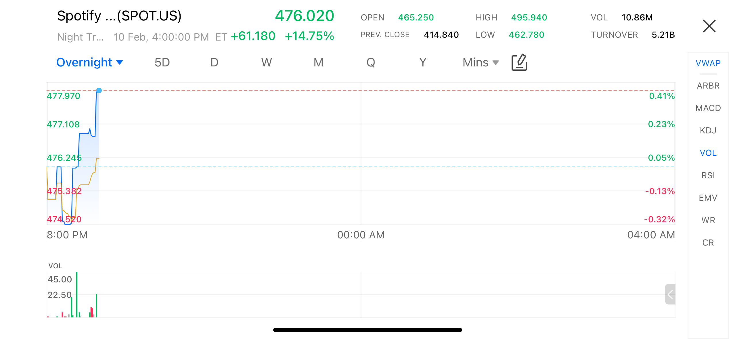 美東時間 2 月 10 日盤後,線上音樂平台 Spotify(SPOT.US)在美股市場顯著走強,股價一度上漲近 15%,盤中高位逼近 480 美元關口,成為當日傳媒與互聯網板塊漲幅居前的個股。