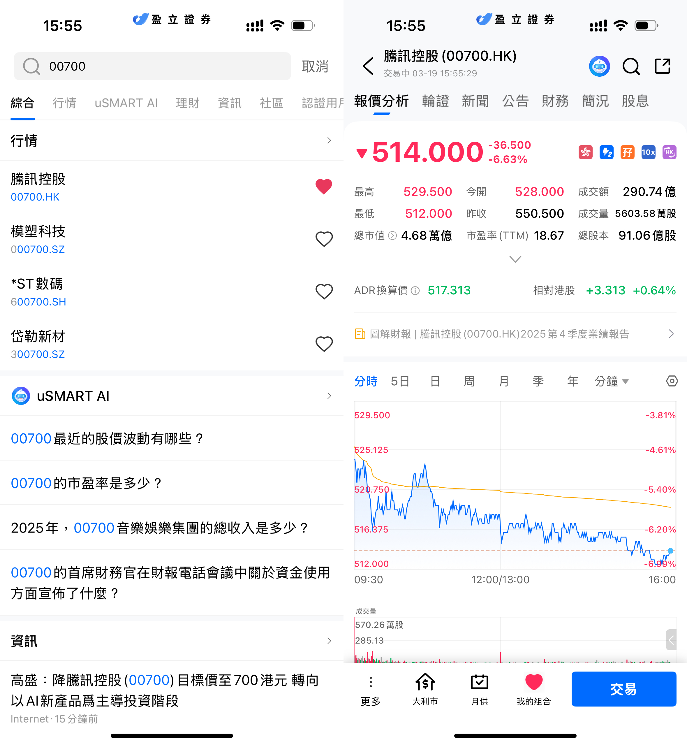 登入 uSMART HK APP 後,於頁面最右上方點擊「搜索」,輸入標的代碼(00700.HK)並進入詳情頁,瞭解交易詳情與歷史走勢。點擊右下角「交易」,選擇交易類型,最後填寫交易條件後送出訂單即可。