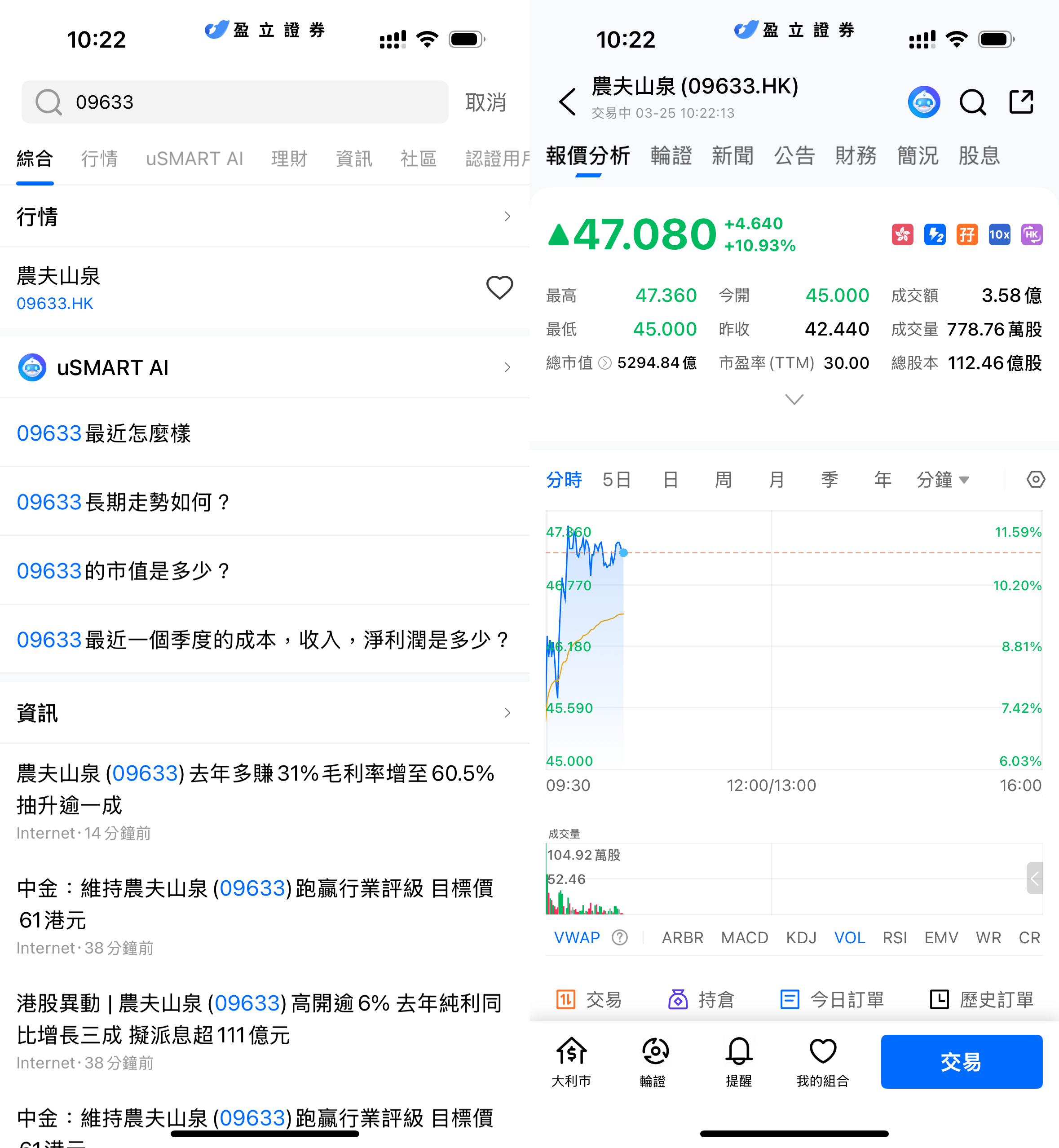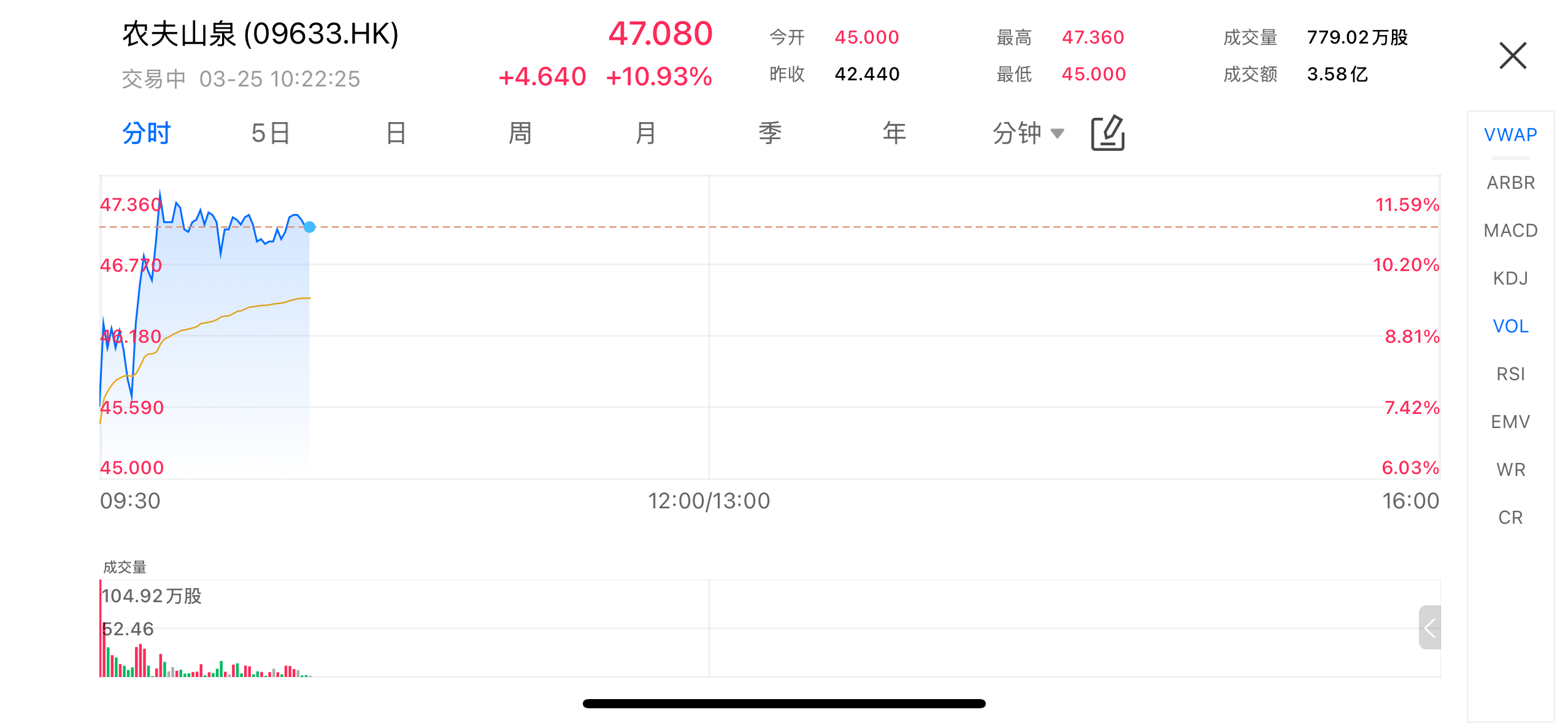 3月25日早盤,港股消費龍頭農夫山泉(09633.HK)股價顯著走強,盤中漲幅一度擴大至近11%。截至10時22分,公司股價報47.08港元,大漲10.93%,成交額達3.58億港元,成交量明顯放大,資金搶籌跡象顯著。