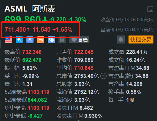 美股異動|阿斯麥盤前升1.65% 股價開盤有望重回700美元上方 獲高盛唱好