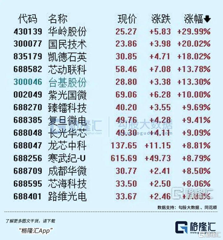 今天,半導體股升幅居前。截至收盤,華嶺股份30CM升停,國民技術20CM升停,此外,凱德石英、芯動聯科、台基股份升幅均超13%,龍芯中科、紫光國微、寒武紀等紛紛大升。