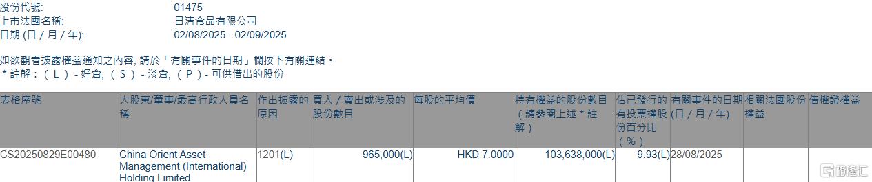 格隆匯9月2日丨根據聯交所最新權益披露資料顯示,2025年8月28日,日清食品(01475.HK)遭China Orient Asset Management (International) Holding Limited在場內以每股均價7.00港元減持96.5萬股,涉資約675.5萬港元。